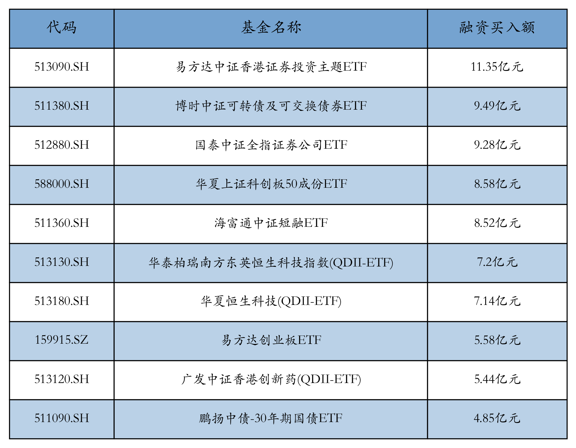 1月8日ETF融资买入额前三位分别为:易方达中证香港证券投资主题ETF(11.35亿元)、博时中证可转债及可交换债券ETF(9.49亿元)和国泰中证全指证券公司ETF(9.28亿元),前10具体见下表: