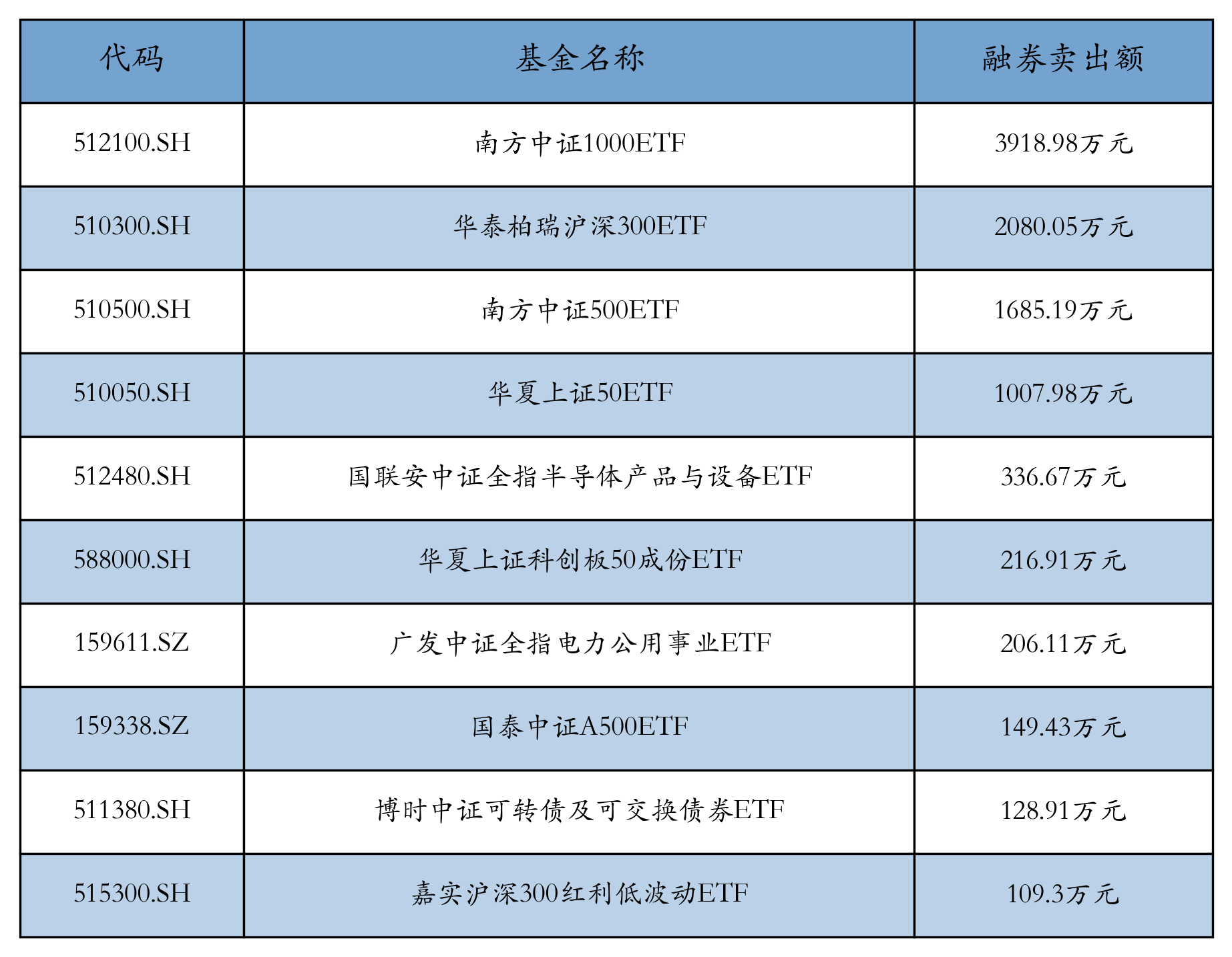 1月8日ETF融券卖出额前三位分别为:南方中证1000ETF(3918.98万元)、华泰柏瑞沪深300ETF(2080.05万元)和南方中证500ETF(1685.19万元),前10具体见下表: