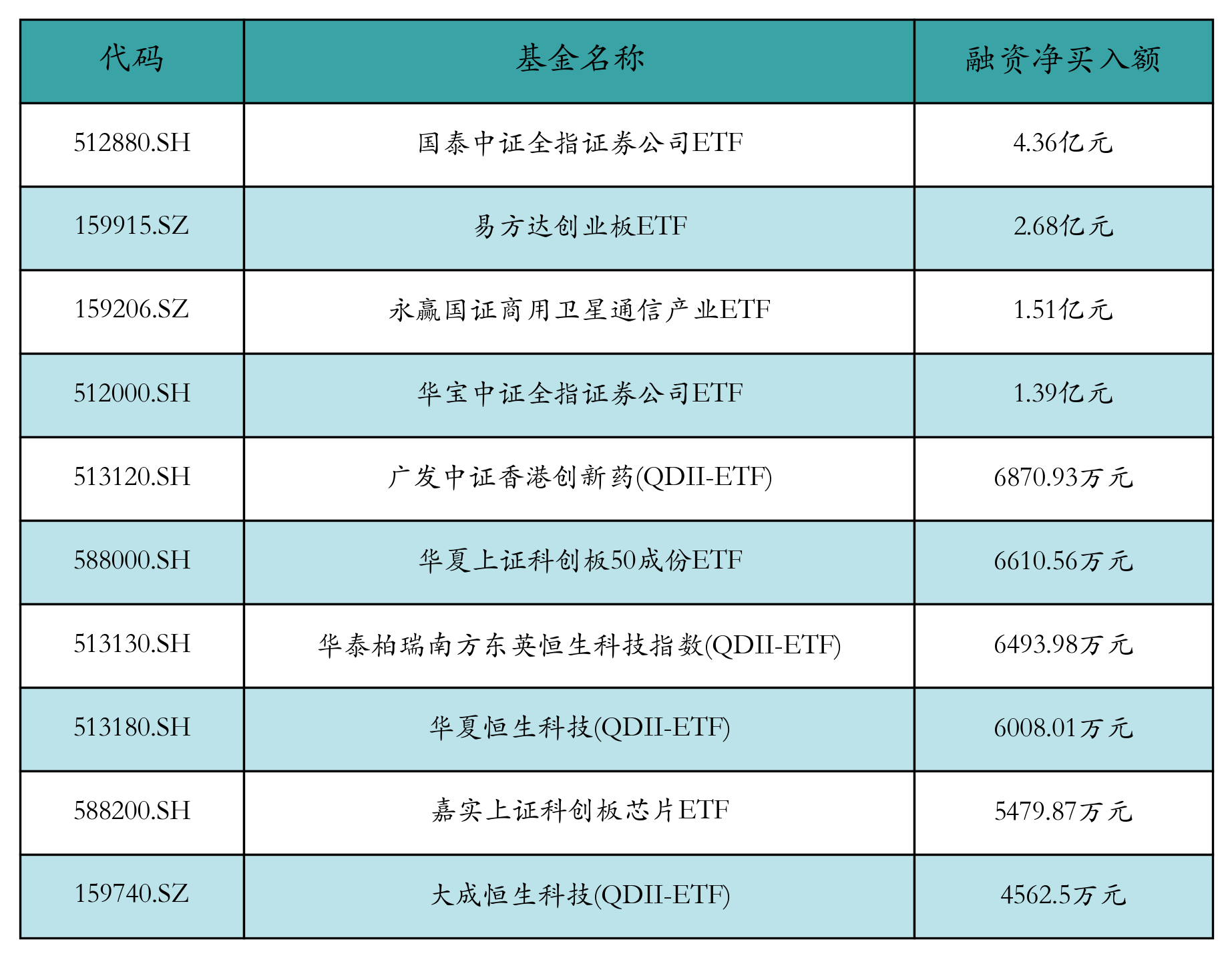 1月8日ETF融资净买入额前三位分别为:国泰中证全指证券公司ETF(4.36亿元)、易方达创业板ETF(2.68亿元)和永赢国证商用卫星通信产业ETF(1.51亿元),前10具体见下表: