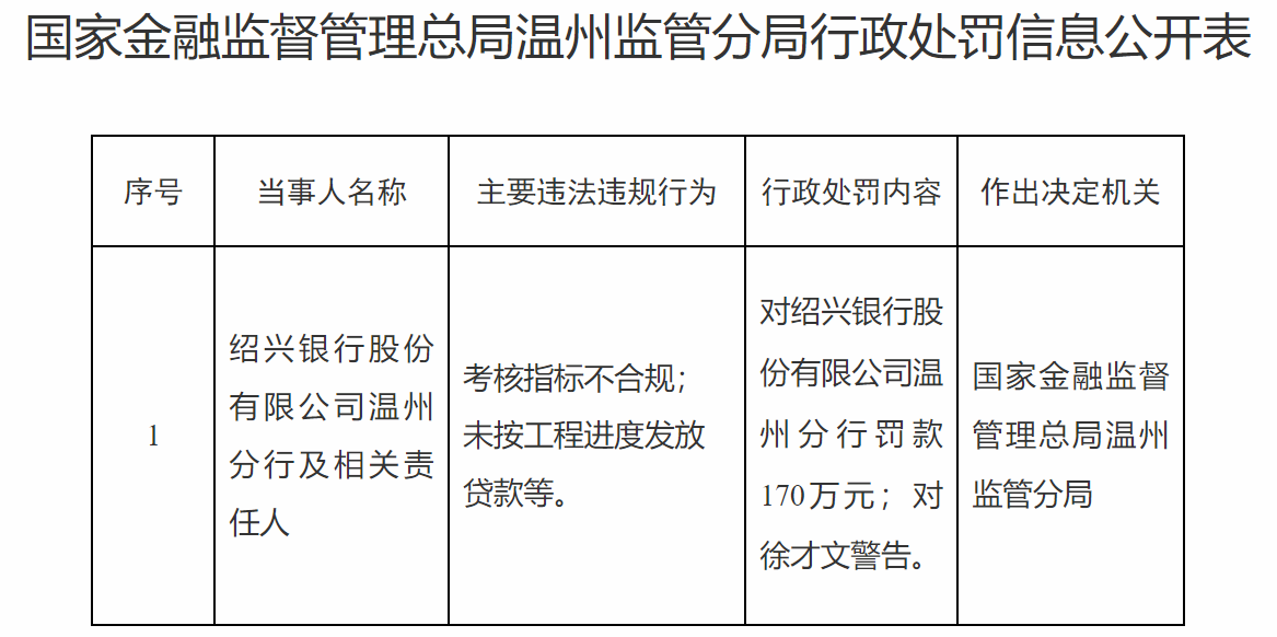 1月9日,国家金融监督管理总局温州监管分局发布的行政处罚信息显示,因考核指标不合规、未按工程进度发放贷款等,国家金融监督管理总局温州监管分局对绍兴银行股份有限公司温州分行罚款170万元,对相关责任人徐才文警告。