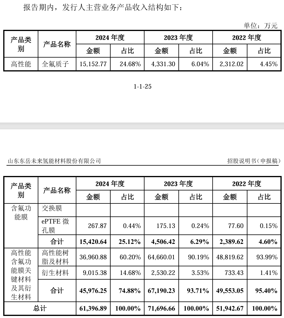 在资本市场与产业舆论中,未来材料常被贴上“氢能第一膜”等标签,产品覆盖氢能相关材料。但其当前收入主要来源仍集中于含氟功能膜及其衍生品,质子交换膜等核心氢能材料占比相对有限(2024年已迅速上升至接近四分之一),其商业化节奏与业绩兑现,仍需更长周期检验。