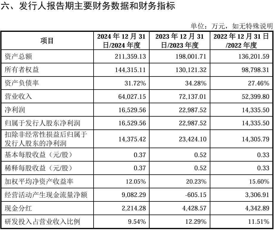 财务表现方面,未来材料的营业收入在2022年至2023年实现增长后,于2024年出现回落。数据显示,2022-2024年,公司营业收入分别为5.24亿元、7.21亿元和6.40亿元,2024年同比下降11.23%;归母净利润分别为1.43亿元、2.30亿元、1.65亿元,2024年降幅达28.26%。