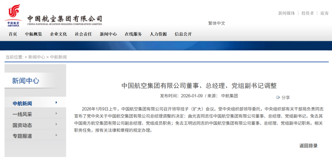 1月9日,中国航空集团有限公司官网显示,中国航空集团有限公司董事、总经理、党组副书记调整。