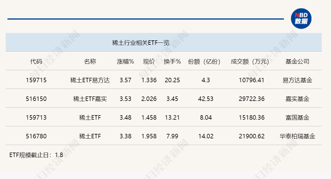 点评:稀土ETF易方达(159715)和稀土ETF嘉实(516150)今日上午分别上涨3.57%和3.53%,其中,稀土ETF嘉实(516150)规模较大,其份额达到42.53亿份,半日成交金额为2.97亿元,该ETF追踪的是中证稀土产业指数,追踪该指数的ETF还包括稀土ETF(159713)和稀土ETF(516780)。