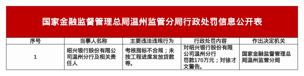 罚单显示,绍兴银行股份有限公司温州分行的主要违法违规事实(案由)为:考核指标不合规;未按工程进度发放贷款等。
