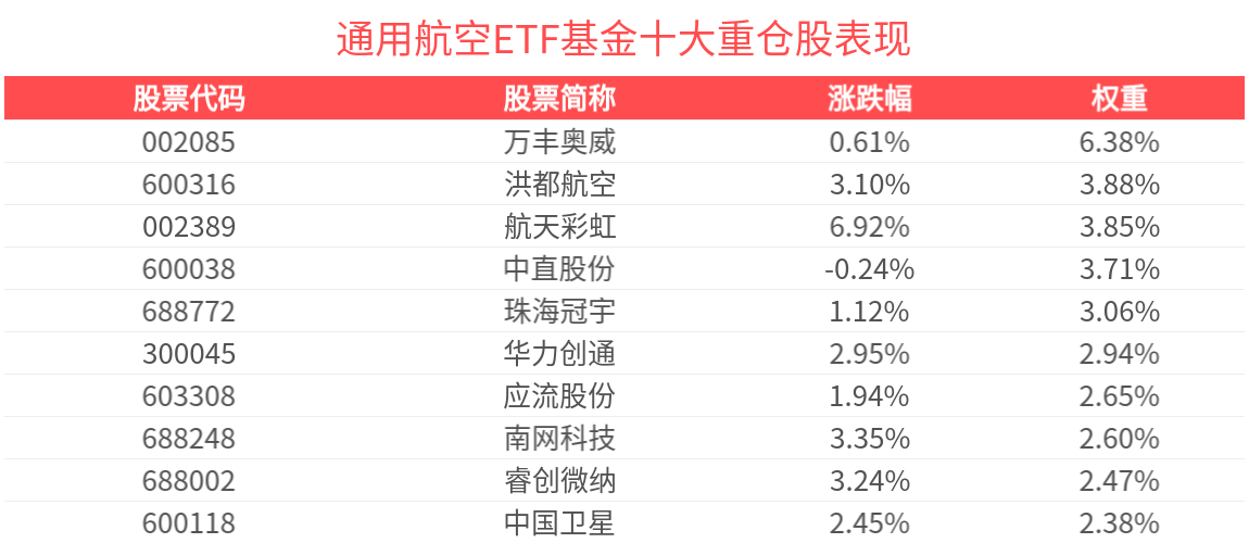 通用航空ETF基金紧密跟踪国证通用航空产业指数,截至2025年12月31日,指数前十大权重股分别为万丰奥威、航天彩虹、中直股份、华力创通、中国卫星、洪都航空、航天电子、中无人机、天银机电、北斗星通,前十大权重股合计占比33.92%。