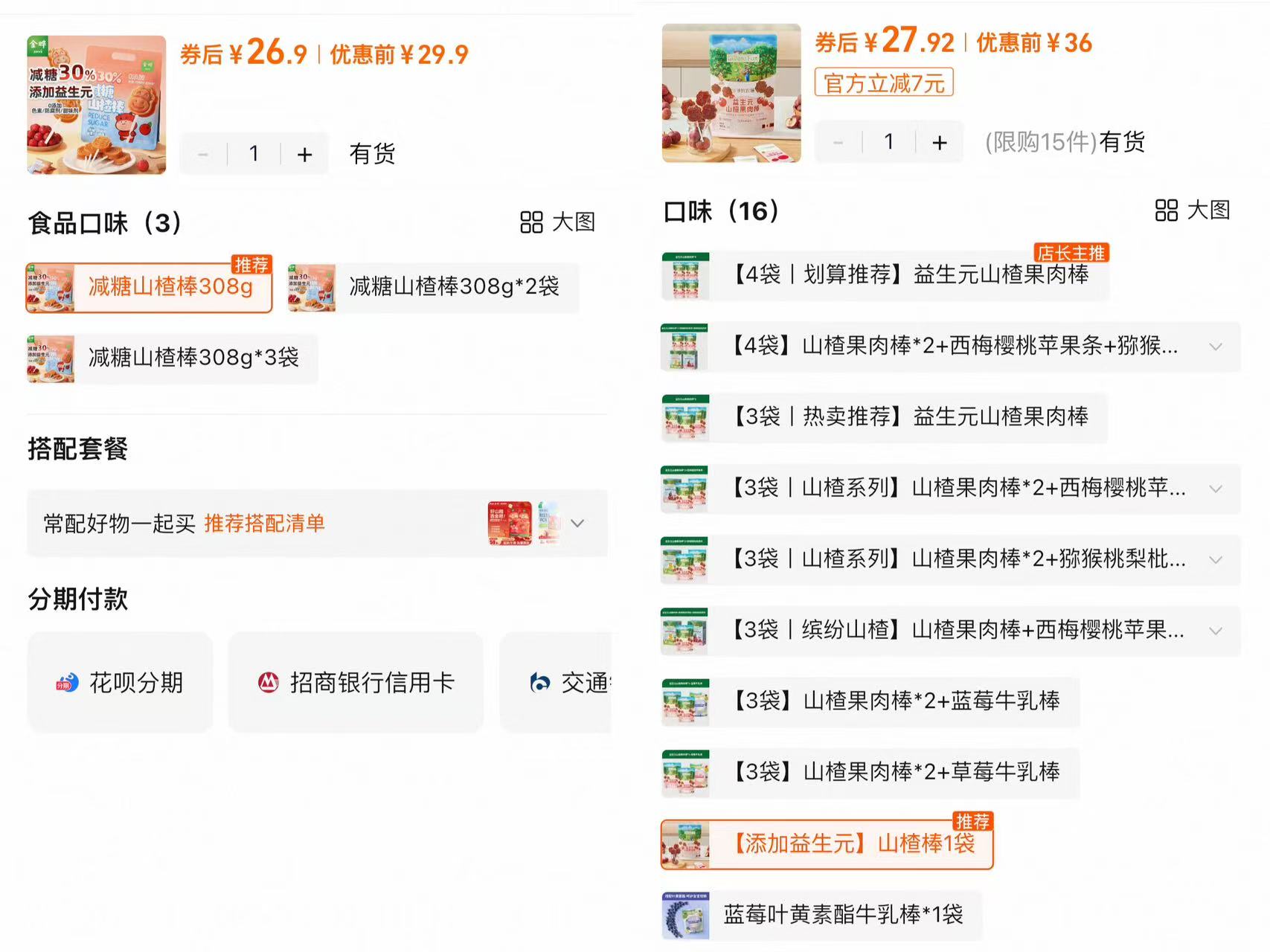 山东金晔益生元山楂棒(左)与爷爷的农场益生元山楂棒(右)