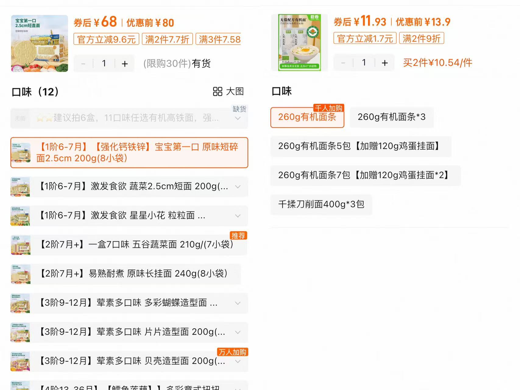 爷爷的农场有机宝宝面(左)与市面常规有机面条(右)