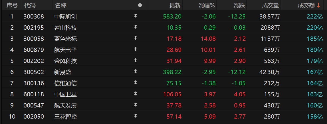 个股方面,中际旭创、岩山科技成交额破200亿元,分别达222亿元和220亿元,蓝色光标、航天电子、金风科技、新易盛成交额靠前。