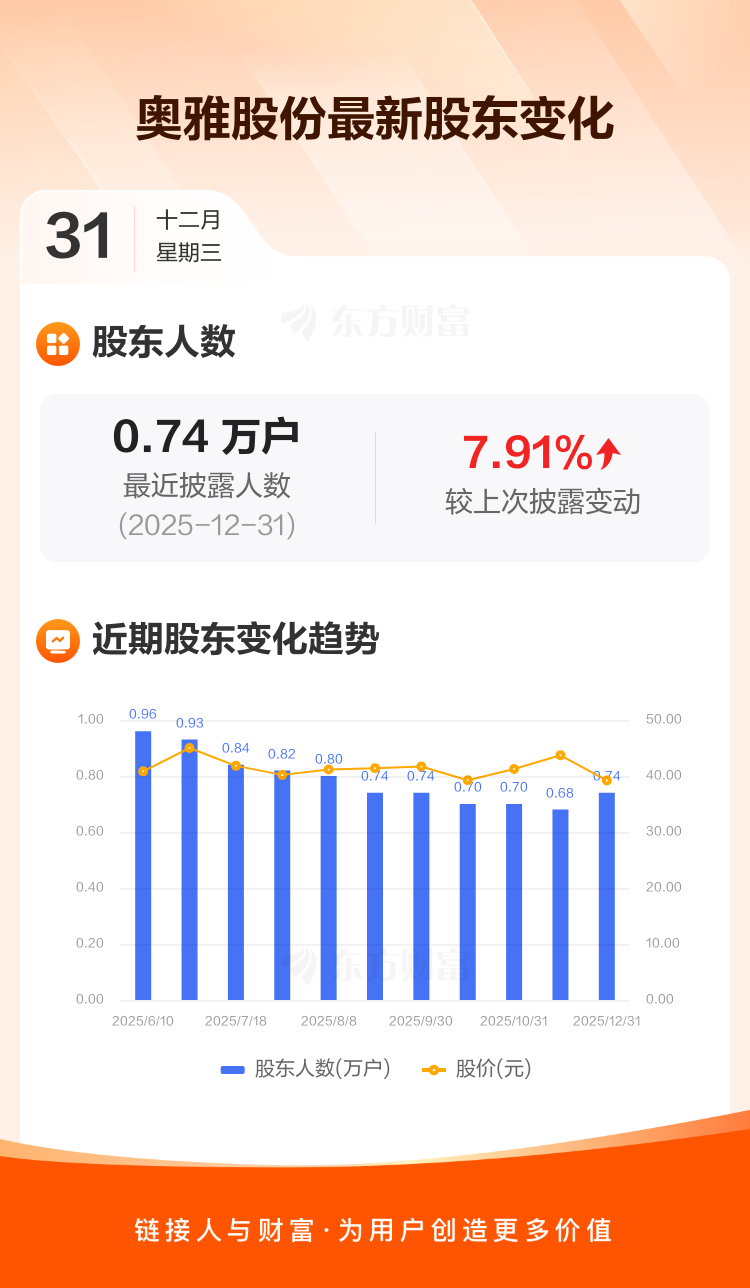 奥雅股份最新披露数据显示,截至12月31日公司股东户数为7355户,较上期(2025年11月10日)增加539户,增幅为7.91%。户均持有流通股数量由上期的5032股下降至4663股,户均持股金额由上期的21.99万元减少至18.28万元。