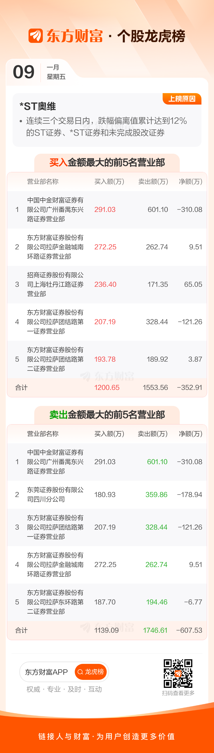 交易所2026年1月9日公布的交易公开信息显示,*ST奥维因成为连续三个交易日内,跌幅偏离值累计达到12%的ST证券、*ST证券和未完成股改证券、严重异常期间日收盘价格跌幅偏离值累计达到70%的证券上榜。*ST奥维当日收报1.21元,涨跌幅-4.72%,换手率15.79%,成交额6057.08万。异常期间1月7日至1月9日,期间涨幅-13.57%,累计偏离值-15.19%,区间成交额1.76亿。严重异常期间11月27日至1月9日,期间涨幅-60.97%,累计偏离值-70.31%,区间成交额11.14亿。