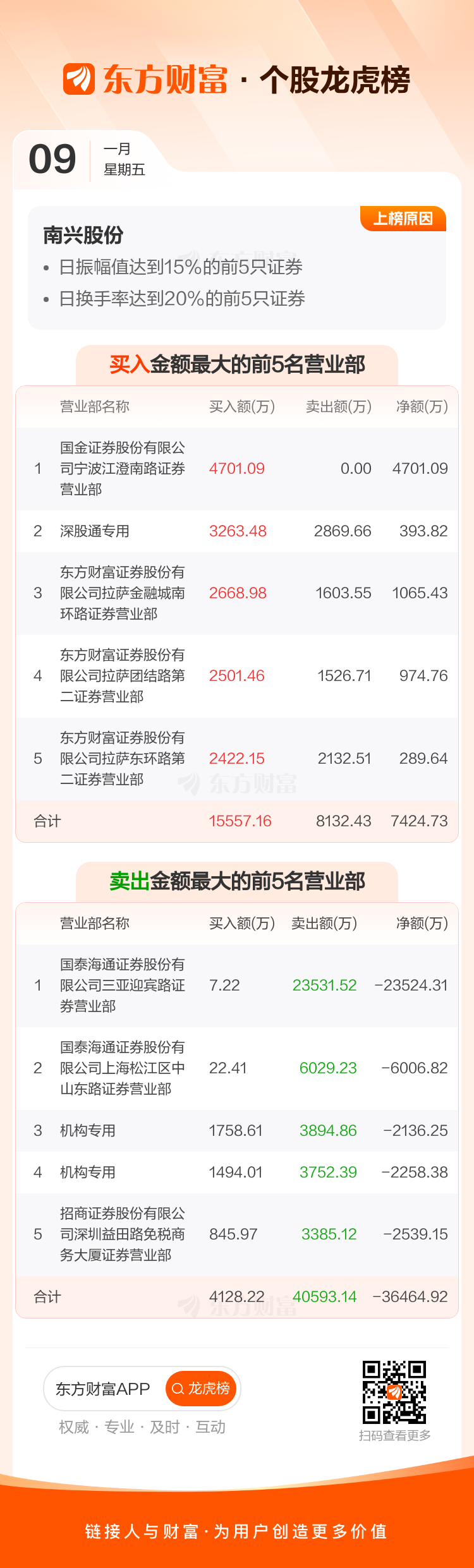 交易所2026年1月9日公布的交易公开信息显示,南兴股份因成为日换手率达到20%的前5只证券、日振幅值达到15%的前5只证券上榜。南兴股份当日收报25元,涨跌幅5.17%,偏离值43.16%,换手率43.49%,成交额29.88亿。