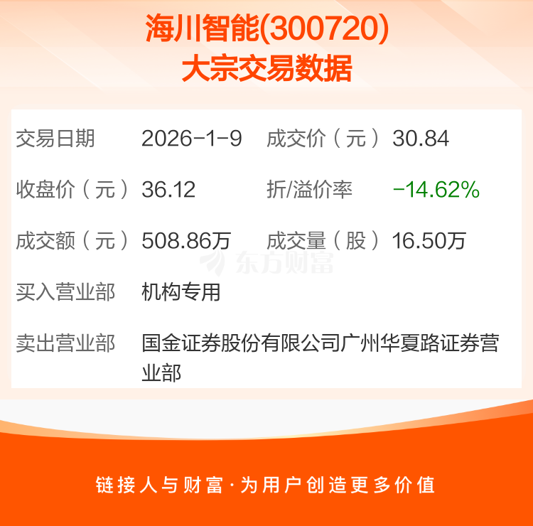 大宗交易:海川智能成交508.86万元,折价14.62%(1-9)