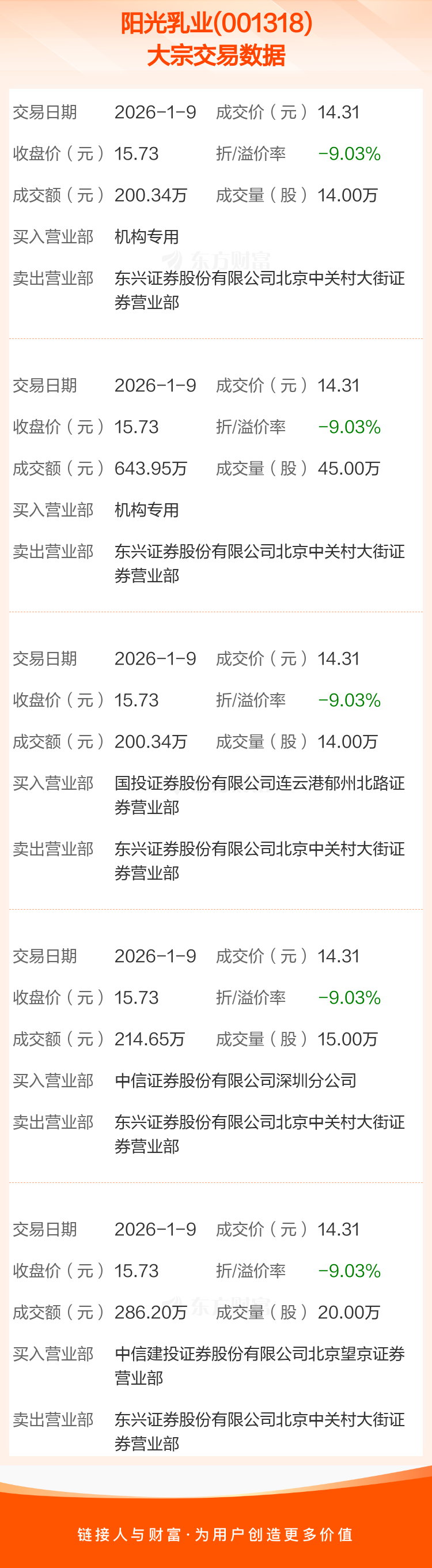 大宗交易:阳光乳业成交1545.48万元,折价9.03%(1-9)