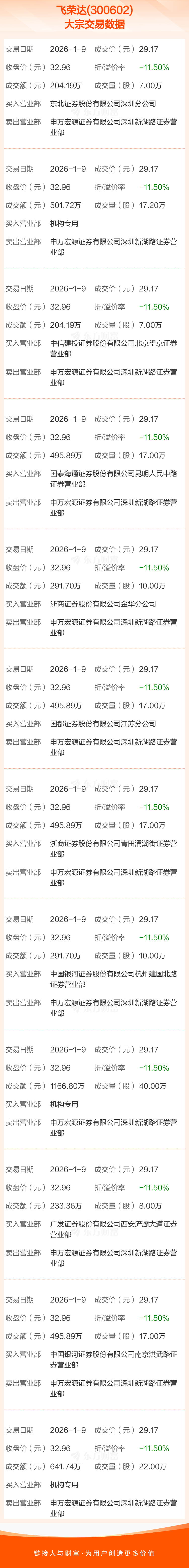 2026年1月9日,飞荣达发生12笔大宗交易,共成交189.20万股,成交金额5518.96万元,占其流通市值比例为0.42%。