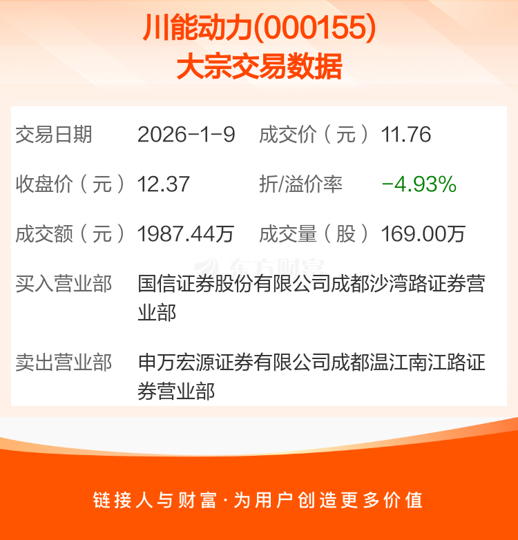 大宗交易:川能动力成交1987.44万元,折价4.93%(1-9)