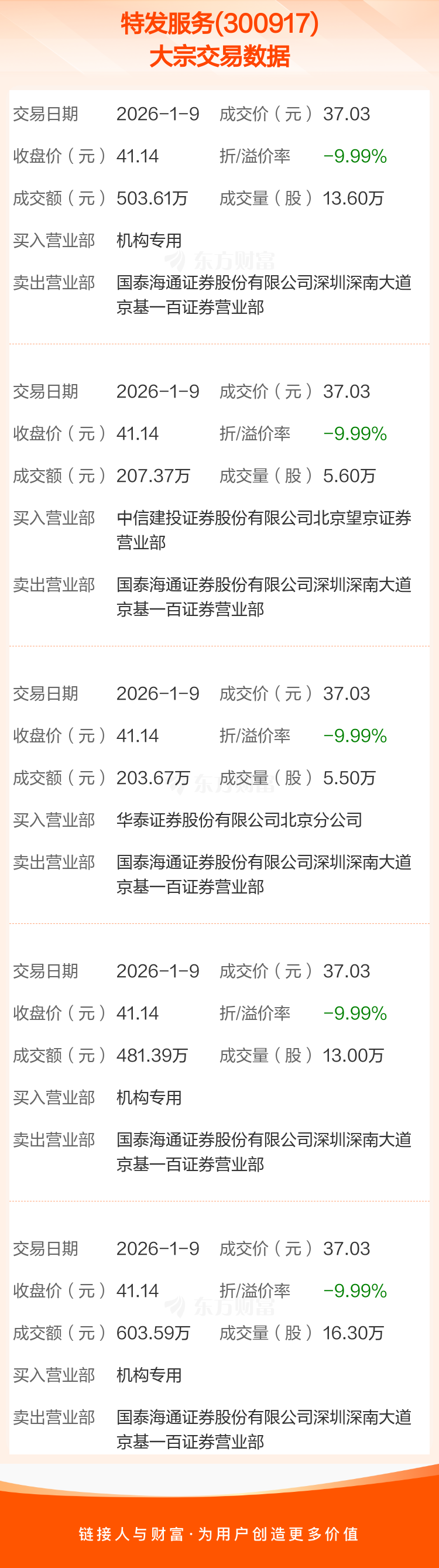 2026年1月9日,特发服务发生5笔大宗交易,共成交54.00万股,成交金额1999.63万元,占其流通市值比例为0.29%。