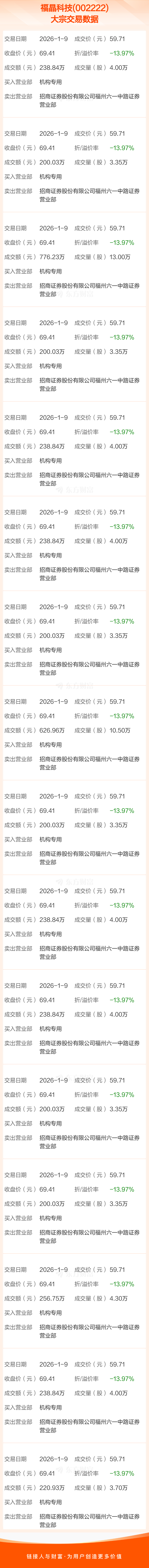 2026年1月9日,福晶科技发生16笔大宗交易,共成交75.60万股,成交金额4514.09万元,占其流通市值比例为0.14%。