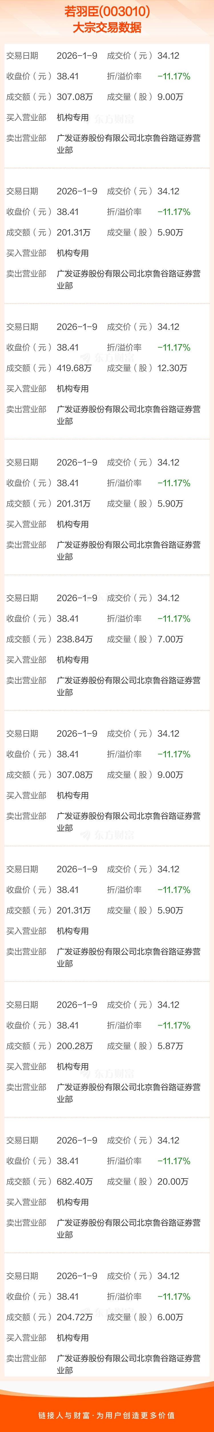 10笔大宗交易成交均价34.12元,较该股当日收盘价38.41元折价11.17%。