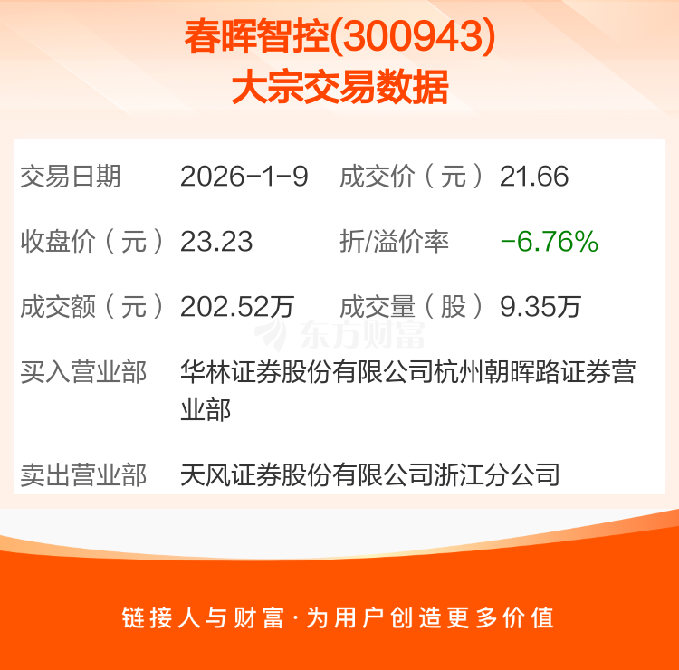 大宗交易:春晖智控成交202.52万元,折价6.76%(1-9)