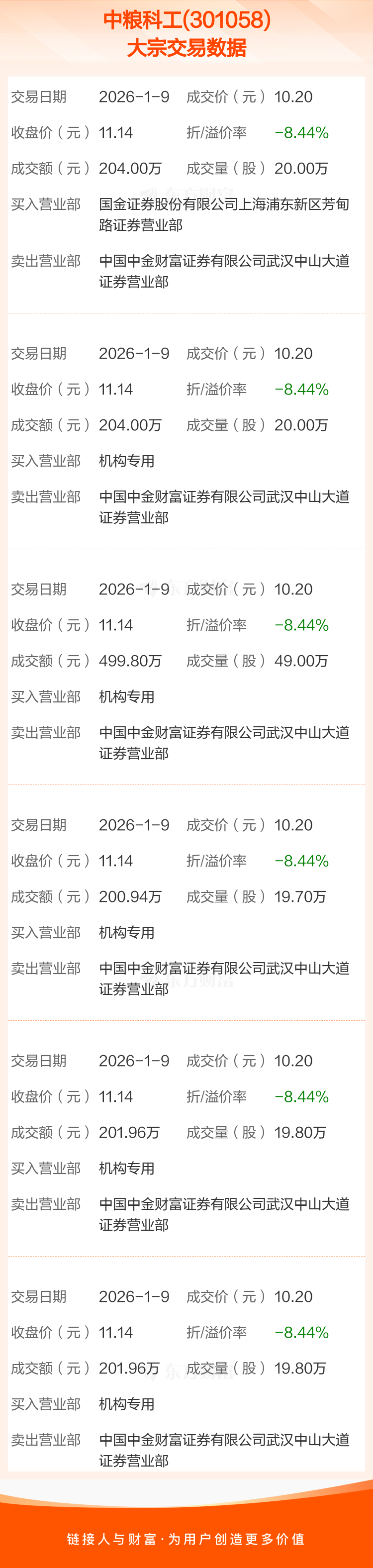 2026年1月9日,中粮科工发生6笔大宗交易,共成交148.30万股,成交金额1512.66万元,占其流通市值比例为0.27%。