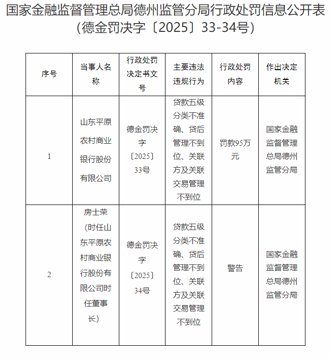 1月7日,国家金融监督管理总局德州监管分局披露的行政处罚信息显示,山东平原农村商业银行股份有限公司及其时任董事长房士荣被处罚。该行因存在“贷款五级分类不准确、贷后管理不到位、关联方及关联交易管理不到位”等主要违法违规行为,被罚款95万元,房士荣被给予警告。