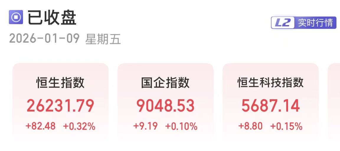 1月9日,港股三大指数收涨。截至收盘,恒生指数涨0.32%,报26231.79点;恒生国企指数涨0.1%,报9048.53点;恒生科技指数涨0.15%,报5687.14点。