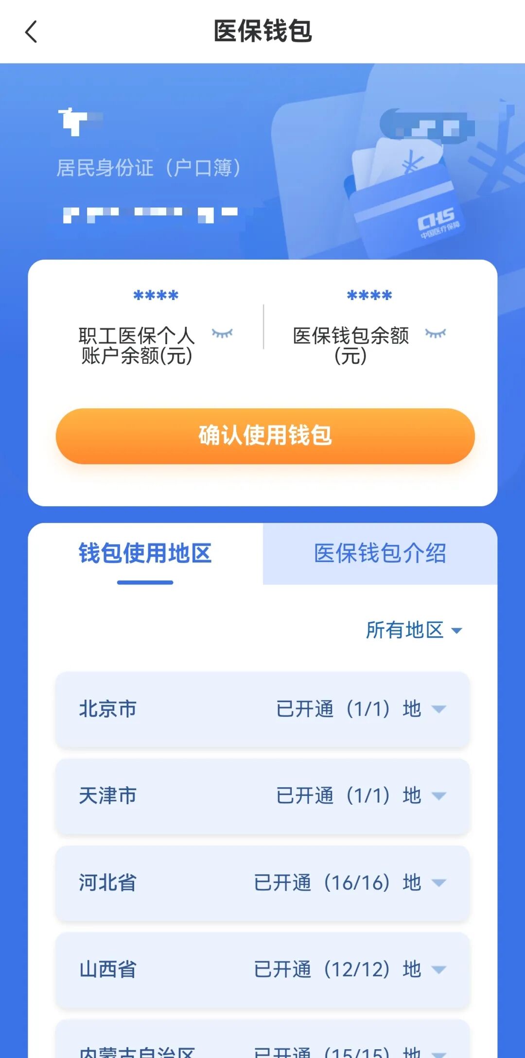 3.在“医保钱包”可查询您和亲人所在的城市是否开通该功能,点击“确认使用钱包”。注意:需要转账人和收款人的地区均开通“医保钱包”功能,才能进行转账。目前全国多个城市正陆续开通运行中。