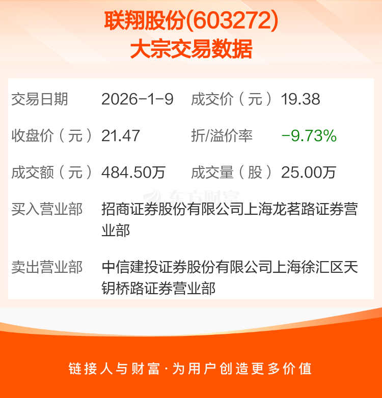 2026年1月9日,联翔股份发生1笔大宗交易,共成交25.00万股,成交金额484.50万元,占其流通市值比例为0.22%。