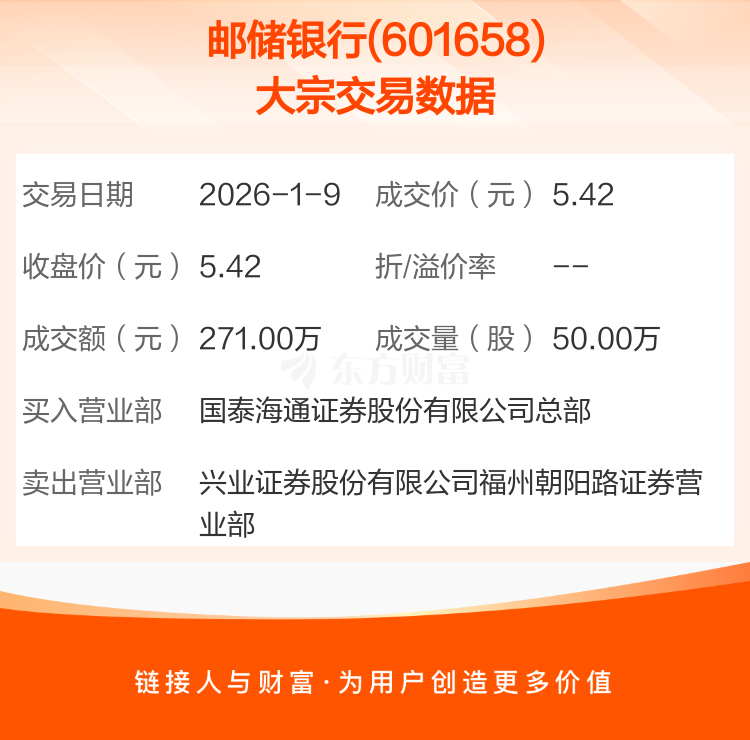 2026年1月9日,邮储银行发生1笔大宗交易,共成交50.00万股,成交金额271.00万元。