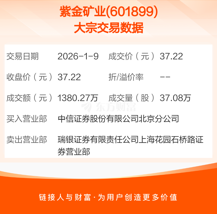 2026年1月9日,紫金矿业发生1笔大宗交易,共成交37.08万股,成交金额1380.27万元。