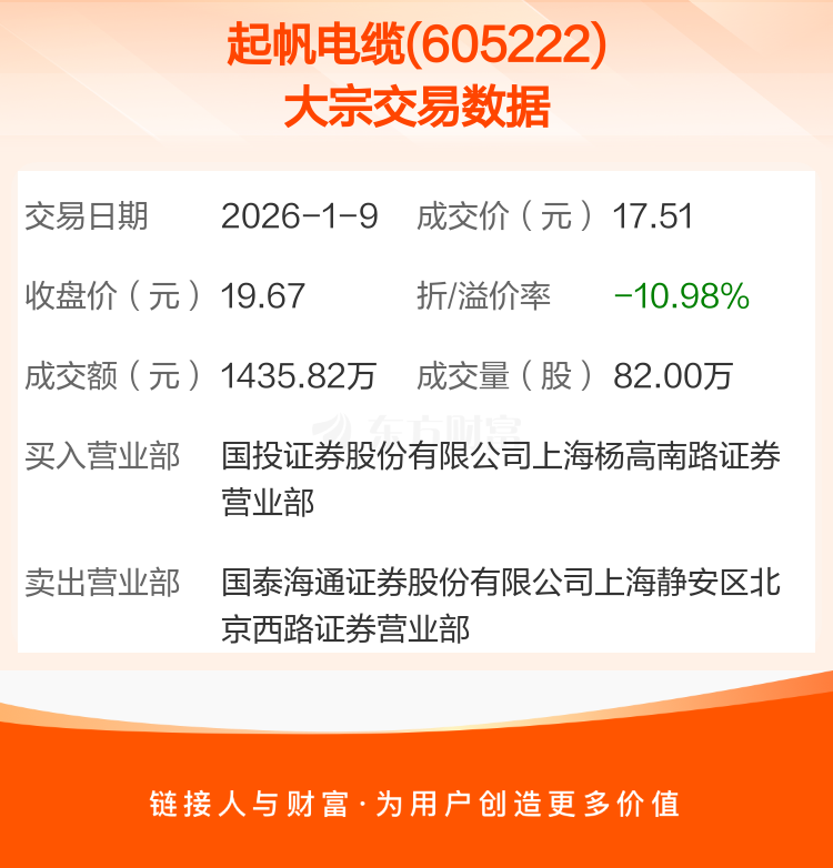 2026年1月9日,起帆电缆发生1笔大宗交易,共成交82.00万股,成交金额1435.82万元,占其流通市值比例为0.18%。