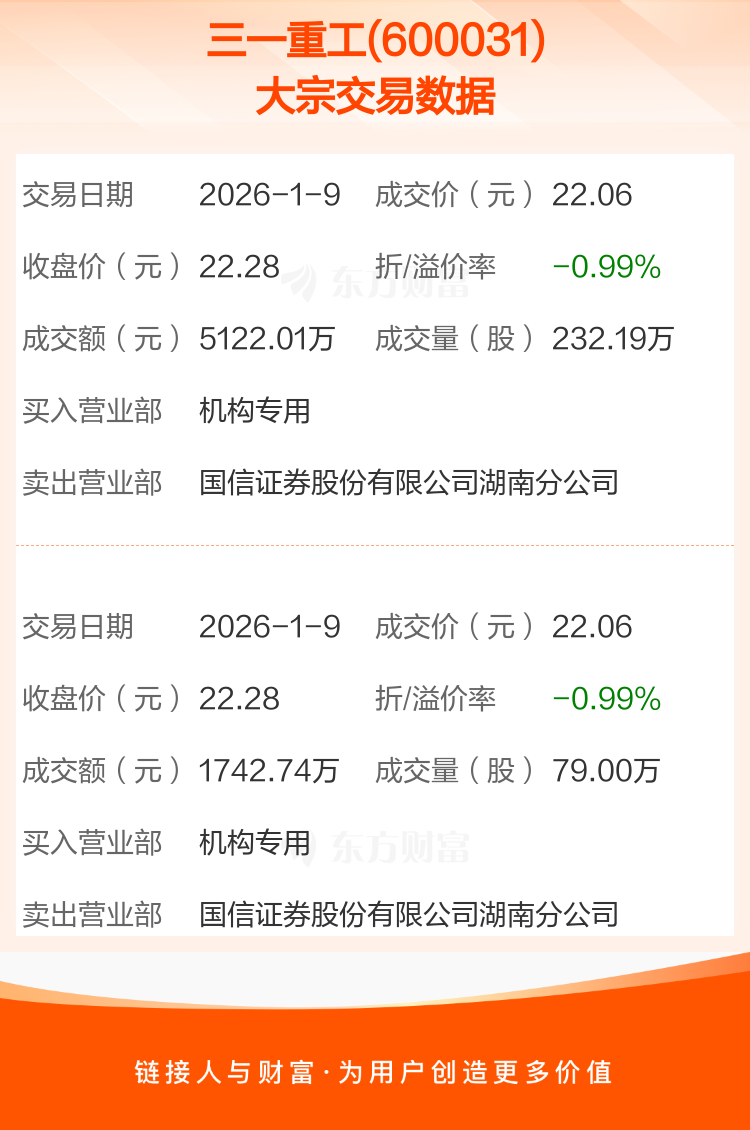 2026年1月9日,三一重工发生2笔大宗交易,共成交311.19万股,成交金额6864.75万元,占其流通市值比例为0.04%。
