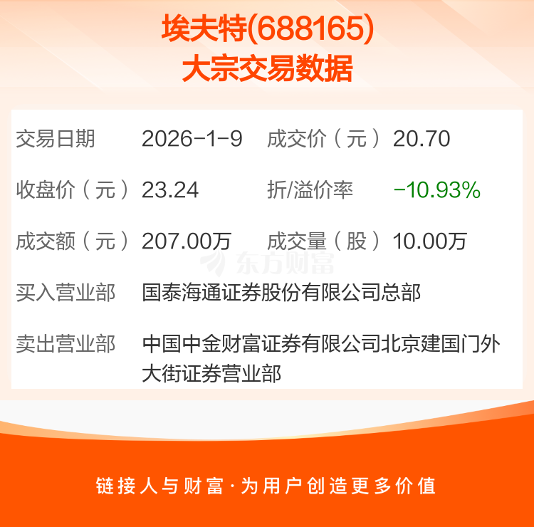 大宗交易:埃夫特成交207.00万元,折价10.93%(1-9)