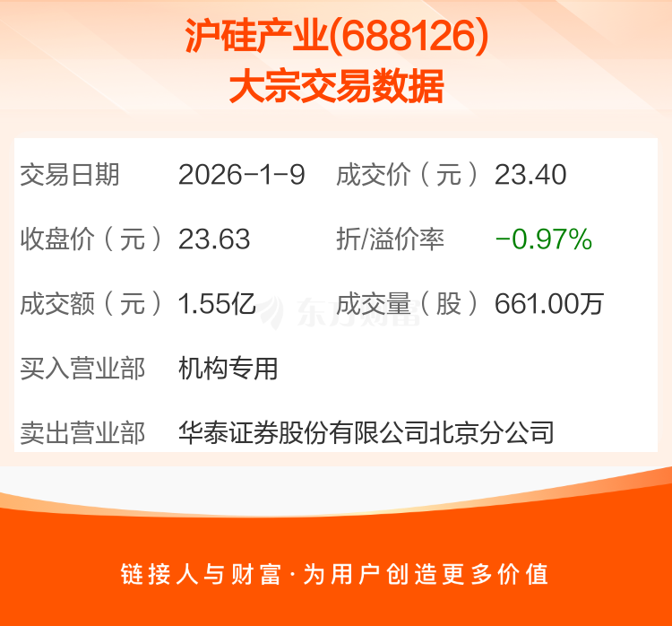2026年1月9日,沪硅产业发生1笔大宗交易,共成交661.00万股,成交金额1.55亿元,占其流通市值比例为0.24%。