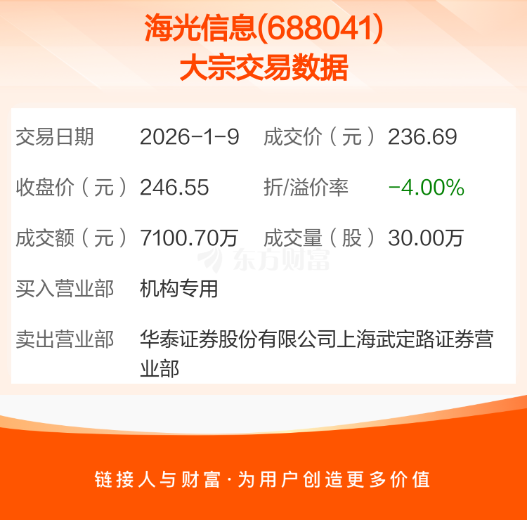 2026年1月9日,海光信息发生1笔大宗交易,共成交30.00万股,成交金额7100.70万元,占其流通市值比例为0.01%。