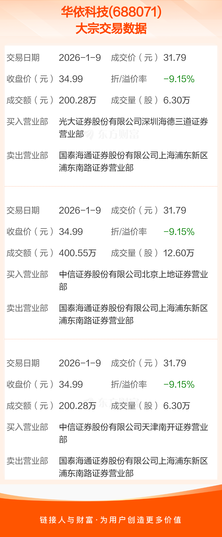 2026年1月9日,华依科技发生3笔大宗交易,共成交25.20万股,成交金额801.11万元,占其流通市值比例为0.27%。