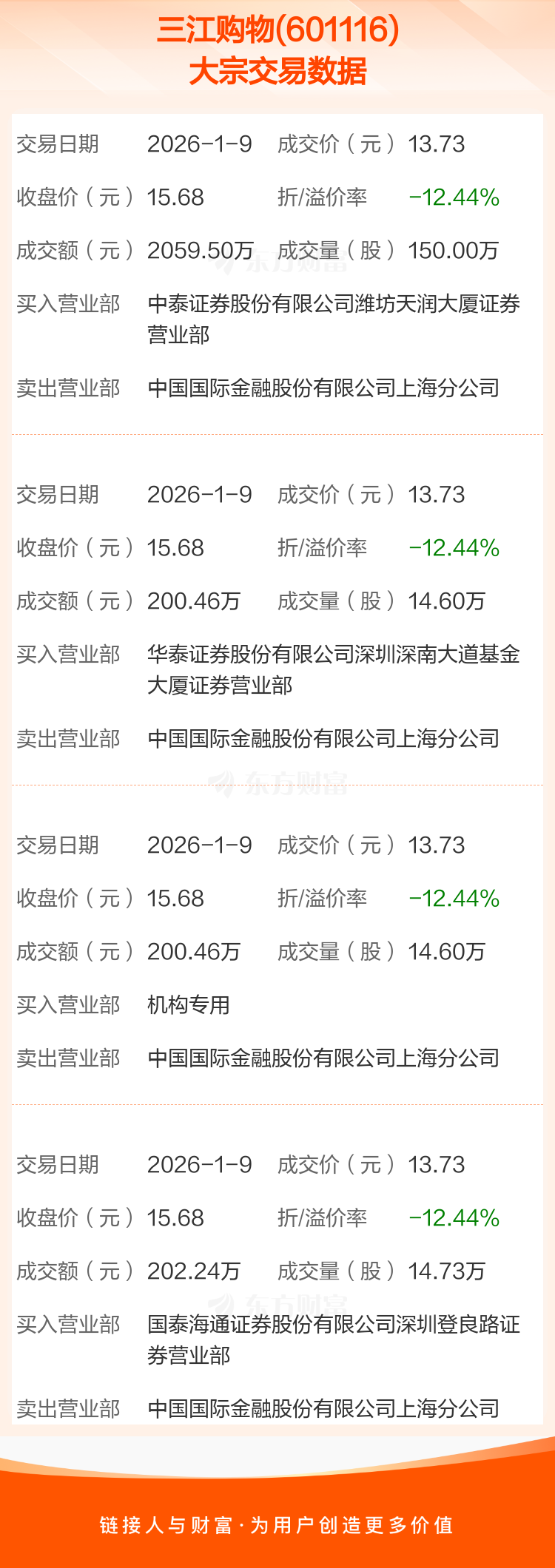 2026年1月9日,三江购物发生4笔大宗交易,共成交193.93万股,成交金额2662.66万元,占其流通市值比例为0.31%。