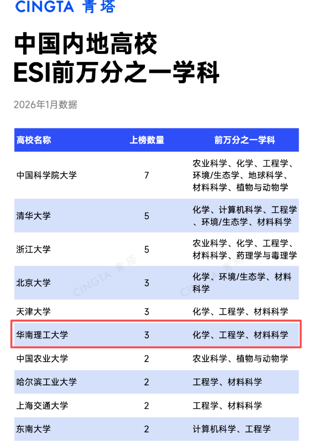 1月8日,科睿唯安公布了基本科学指标数据库ESI(Essential Science Indicators,简称ESI)最新统计数据。华南理工大学“材料科学”学科首次进入全球前万分之一行列,全球排名第16名,标志着学校材料科学领域的研究水平达到世界顶尖层次。