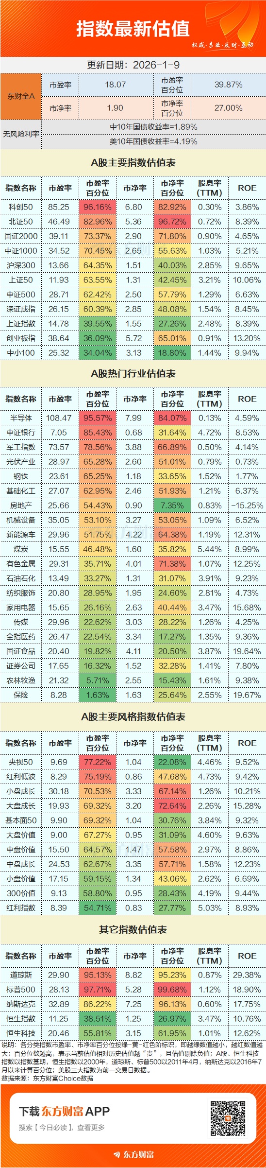 截至1月9日收盘,东方财富Choice数据显示,东财全A市盈率为18.07倍,市盈率百分位为39.87%;市净率为1.9倍,市净率百分位为27%。