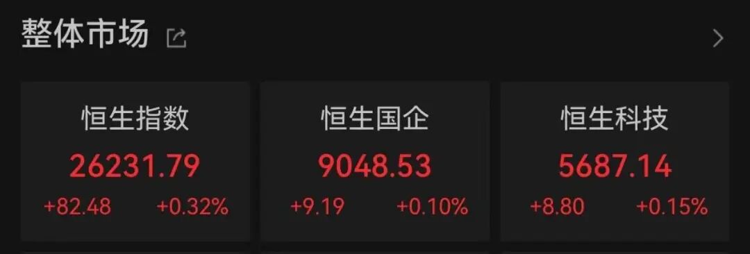 1月9日,港股三大指数震荡小幅收涨。截至收盘,恒生指数上涨0.32%,报收于26231.79点;恒生国企指数和恒生科技指数分别上涨0.1%、0.15%。