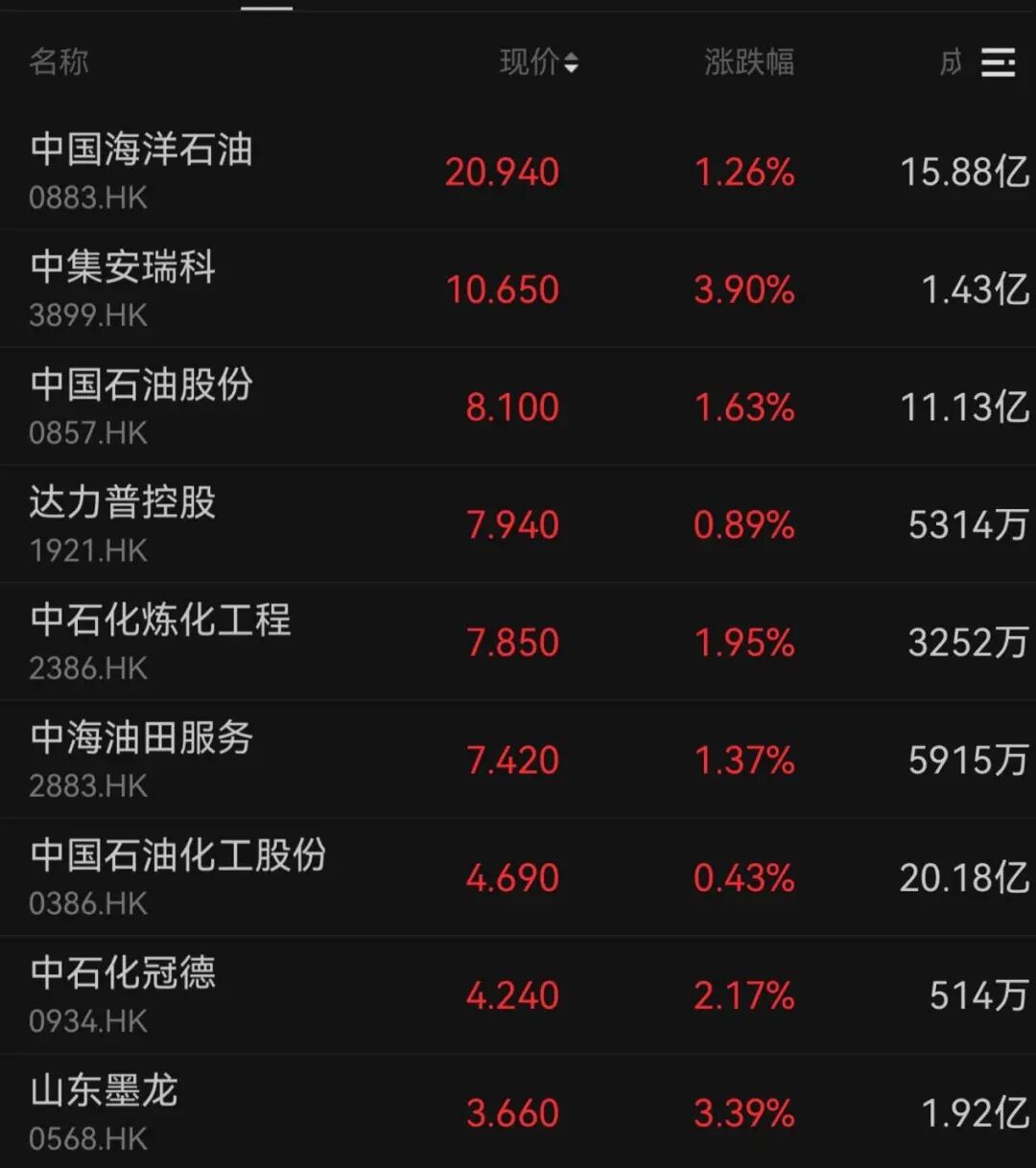 港股石油股今日普涨。
