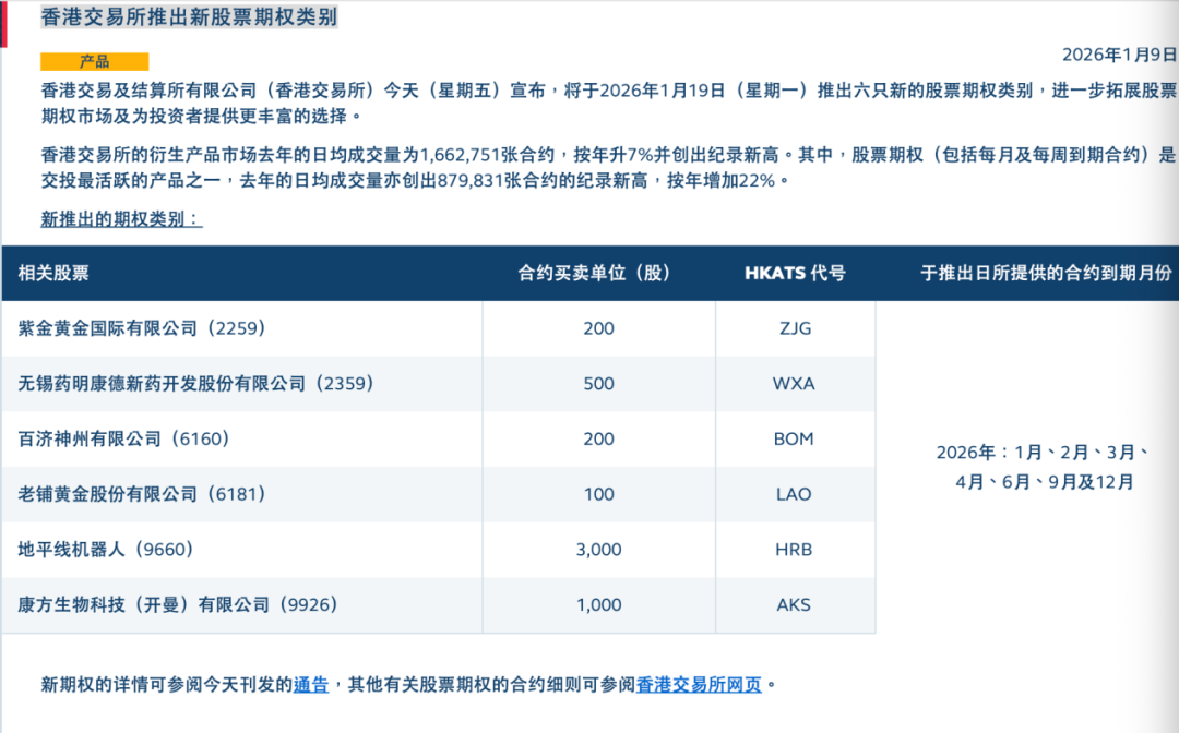 香港交易所今天宣布,将于2026年1月19日(星期一)推出六只新的股票期权类别,进一步拓展股票期权市场及为投资者提供更丰富的选择。香港交易所的衍生产品市场去年的日均成交量为1,662,751张合约,按年升7%并创出新高。其中,股票期权(包括每月及每周到期合约)是交投最活跃的产品之一,去年的日均成交量亦创出879,831张合约的纪录新高,按年增加22%。