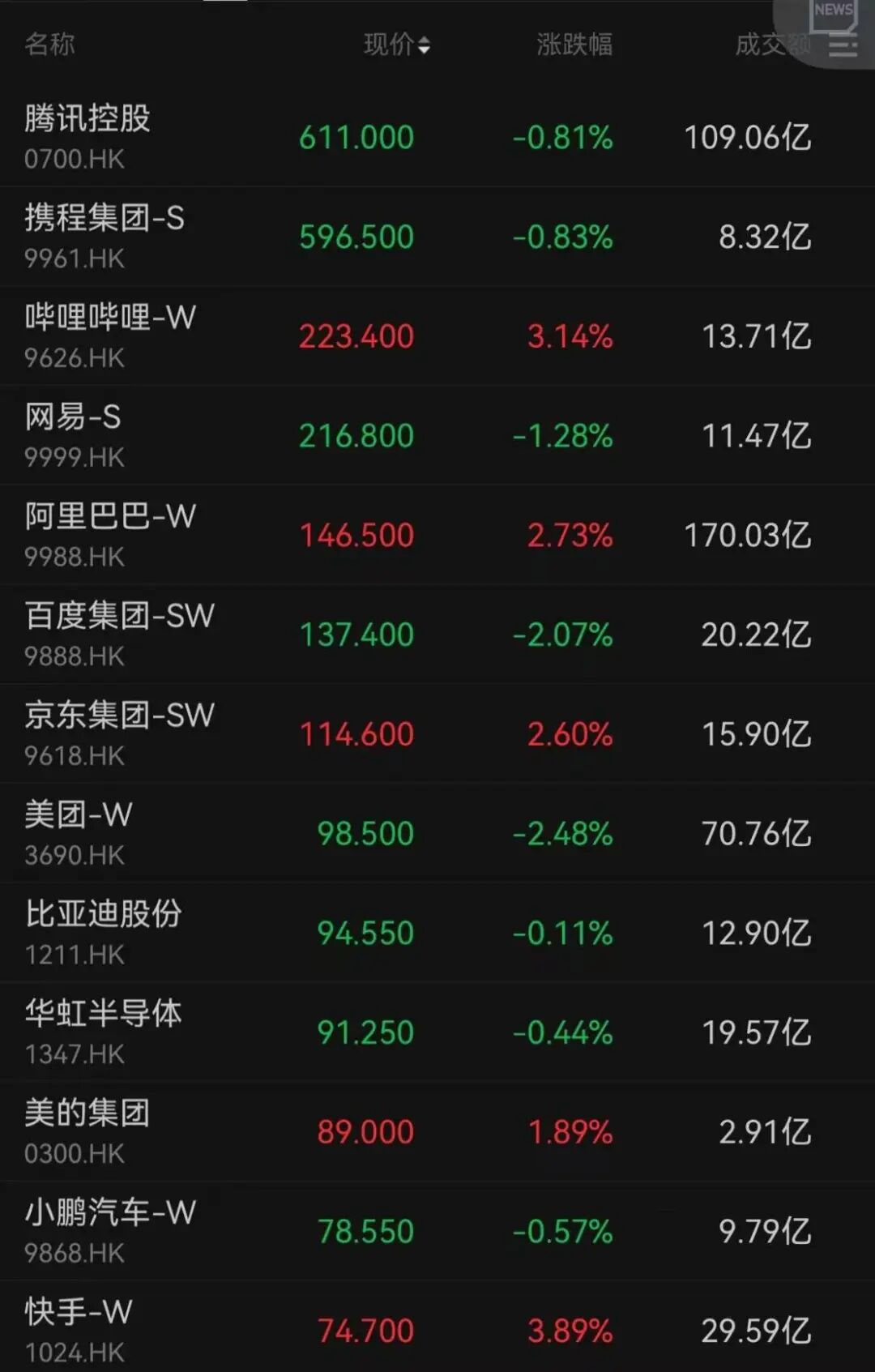 今日,恒生科技指数小幅收涨0.15%,成份股走势分化。哔哩哔哩、阿里巴巴、京东集团分别上涨3.14%、2.72%、2.6%;腾讯控股、网易、百度、美团分别下跌0.81%、1.28%、2.07%、2.48%。其中,腾讯控股和阿里巴巴今日成交额均超过百亿港元。
