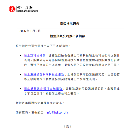 恒生指数公司公告,今天推出以下三条新指数:恒生双科技指数、恒生港股通互联网科技业指数、恒生港股通非银行金融指数。