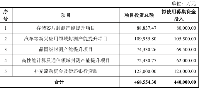 汽车等新兴应用领域封测产能提升项目计划投资10.996亿元,项目建成后年新增汽车等新兴应用领域封测产能5.04亿块。本项目新增产能主要面向车载等高标准、高可靠性领域布局,强化高端产品的封测能力,优化公司产能结构,更好满足下游车规等高标准产品的封测需求。
