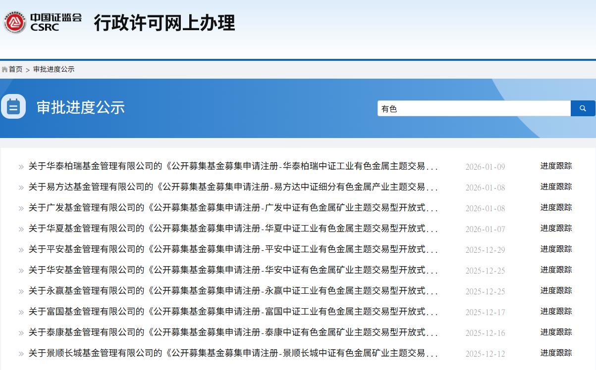 Wind数据显示,2025年12月以来,截至2026年1月9日,已有华泰柏瑞基金、华夏基金、平安基金、永赢基金、富国基金、博时基金、鹏华基金、天弘基金上报中证工业有色金属主题ETF,此外,广发基金、华安基金、泰康基金、景顺长城基金上报了中证有色金属矿业主题ETF,易方达基金上报了中证细分有色金属产业主题ETF。值得注意的是,2025年12月上报的部分产品已经迅速获批。