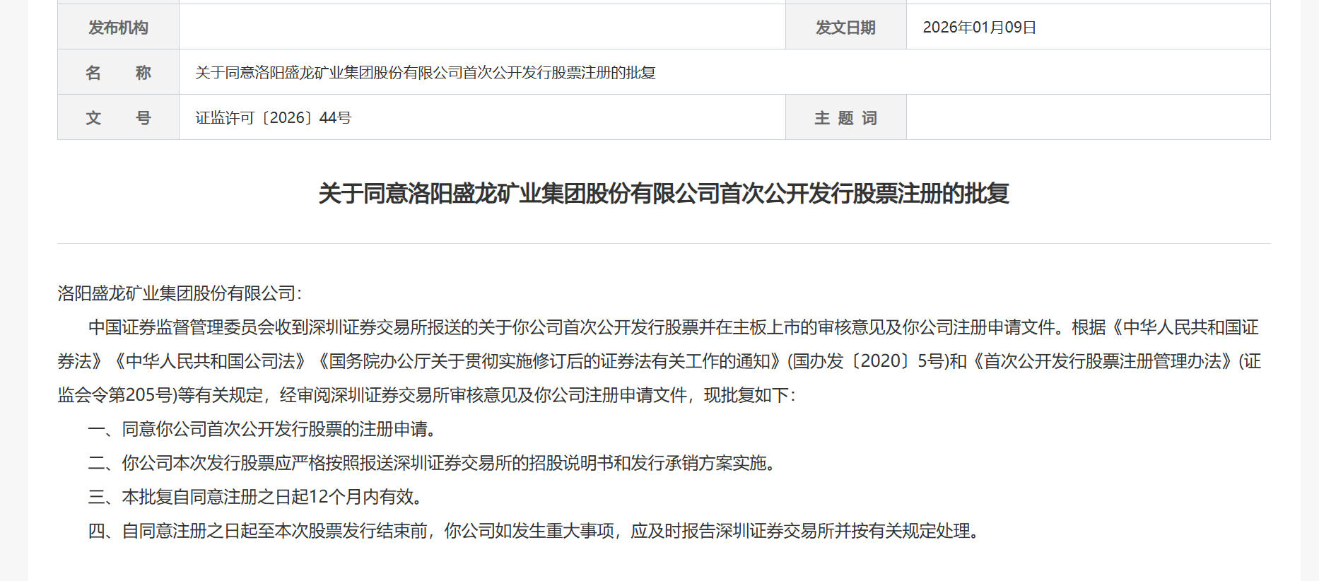 本报讯 (记者肖艳青)1月9日,中国证监会官网消息,证监会批复同意洛阳盛龙矿业集团股份有限公司(以下简称“盛龙股份”)首次公开发行股票的注册申请。本批复自同意注册之日起12个月内有效。