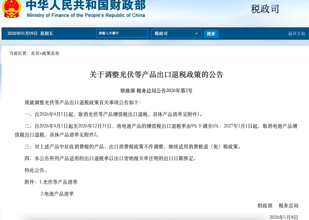 2026年1月9日,财政部、国家税务总局发布关于调整光伏等产品出口退税政策的公告,明确自2026年4月1日起,取消光伏等产品增值税出口退税。