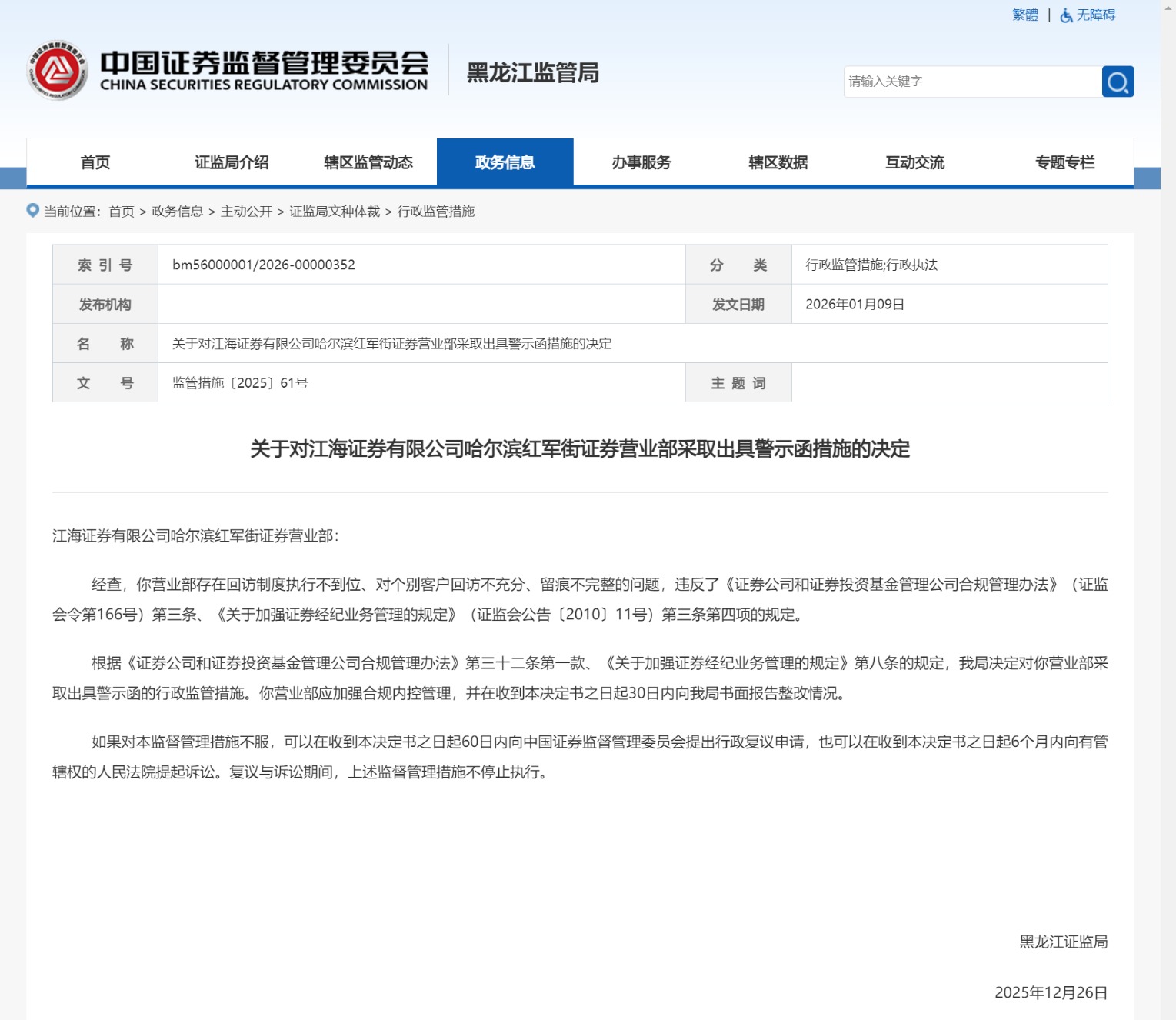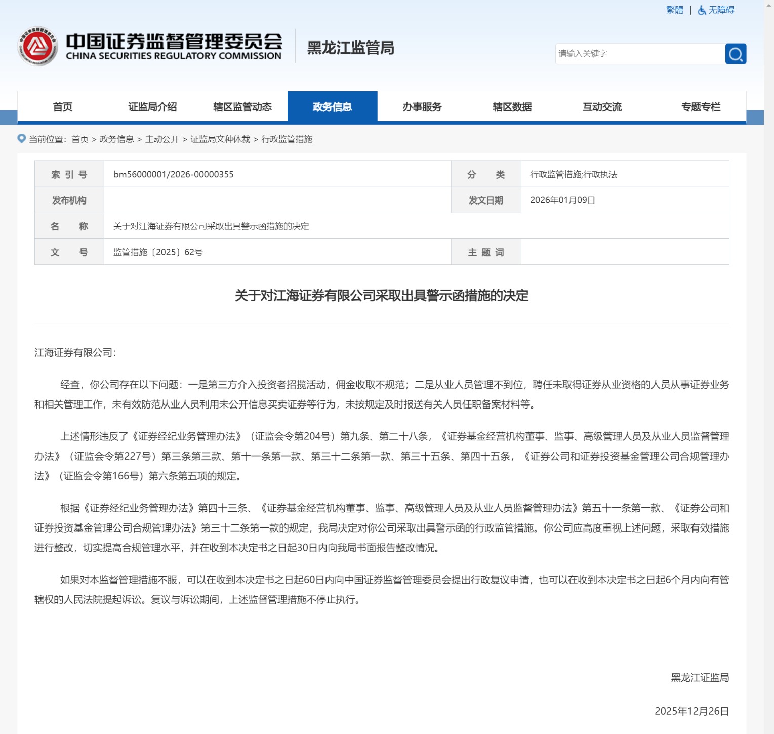 1月9日,黑龙江证监局官网发布对江海证券有限公司(以下简称江海证券)采取出具警示函措施的决定、对江海证券哈尔滨红军街证券营业部采取出具警示函措施的决定。